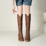 A modern twist on a Western classic. These tall cowboy boots feature a sleek silhouette with refined embroidery and a sturdy block heel that adds height without compromising comfort. Crafted from soft faux leather, they bring effortless sophistication to any look—perfect for everything from daytime denim to flowy dresses.