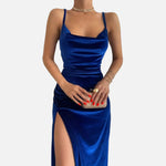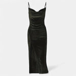 This piece is crafted to enhance your figure while offering the comfort your lifestyle deserves. From the smooth spaghetti straps to the artful ruching and timeless split-thigh detail, each element works together to create effortless sophistication. Whether cherished for autumn dinners, festive gatherings or elegant parties, this dress gives your wardrobe a touch of understated luxury.