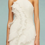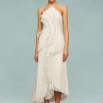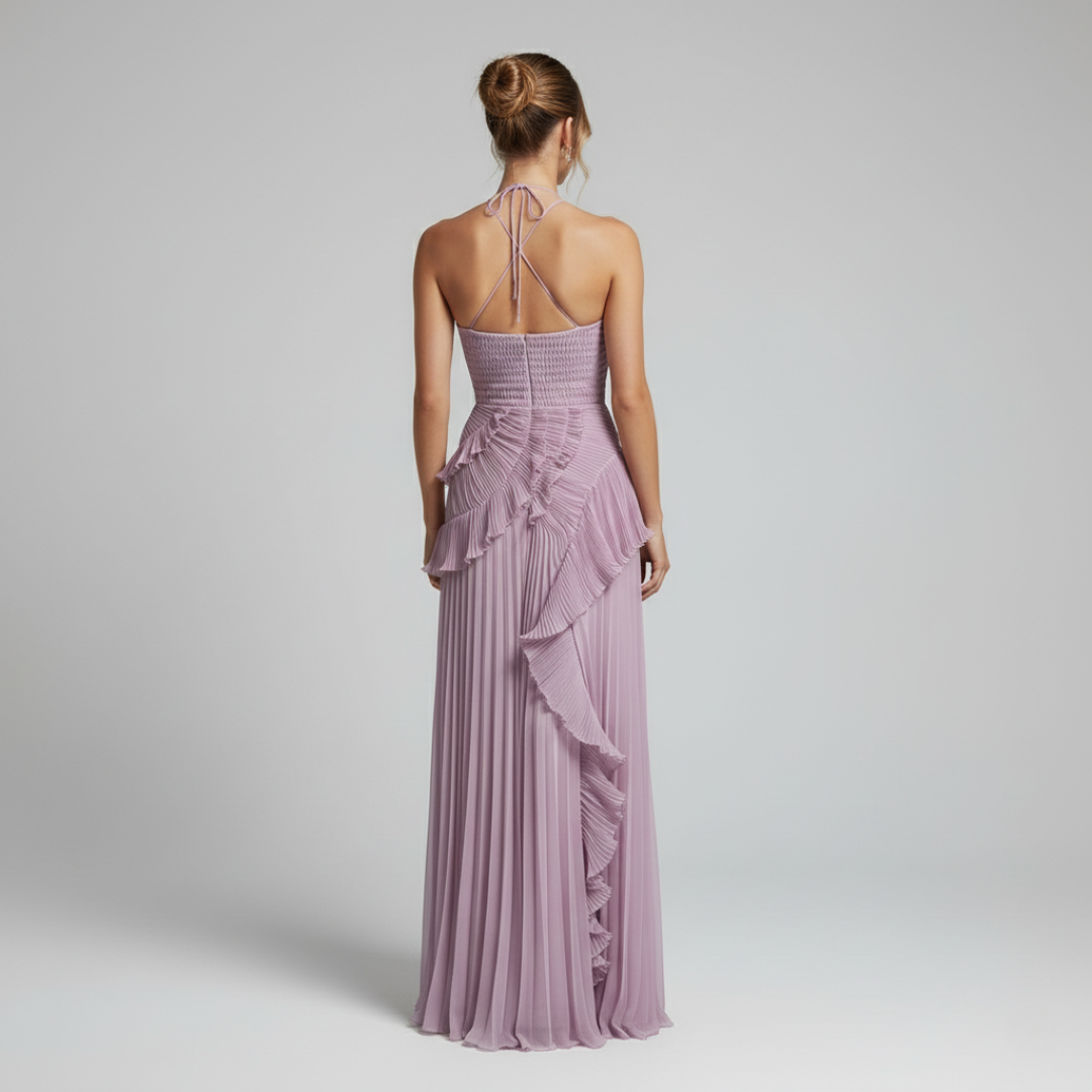 Designed to make an entrance, the Emma Ruffle Maxi Dress captures romantic elegance with every movement. This statement piece features layers of soft pleated ruffles that cascade beautifully from the fitted bodice to the flowing hemline, creating a sculptural yet feminine silhouette. The halter neckline with delicate cross-back straps adds a refined touch, perfect for weddings, galas, and summer soirées.