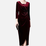 The Legacy Sydney| Velvet Draped Wrap Dress brings a sense of opulent warmth to your autumn and winter wardrobe. Its rich velvet texture catches the light with a soft, regal glow, while the draped silhouette and deep V-neck create an effortlessly elegant presence. This is the dress that turns quiet moments into memorable ones — perfect for refined dinners, winter soirées, and intimate celebrations.