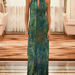 Art meets fashion in this Monet-inspired maxi dress, capturing the elegance of Claude Monet’s Irises with its painterly blend of blues, purples, and greens. The high neckline and keyhole opening create a refined yet alluring silhouette, while the open back adds a striking finish. Crafted from lightweight textured chiffon, it drapes beautifully for formal occasions.