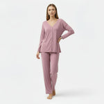 - Relaxed long-sleeve cardigan and matching trousers – A complete set that brings coordinated elegance to your homewear.