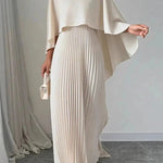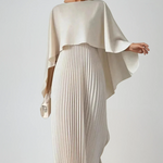 Graceful movement meets modern elegance in this pleated batwing sleeve maxi dress. Featuring a high neckline and dramatic cape-inspired sleeves, this silhouette flows effortlessly with every step. The fine pleats add structure and dimension, while the soft rayon blend ensures a gentle drape and luxurious feel.