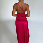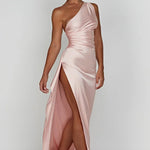Sleek and striking, this floor-length gown is made for unforgettable moments. Crafted from glossy satin, it features a contemporary one-shoulder cut and a daring thigh-high slit. The body-hugging design flatters your curves and creates a glamorous statement that’s perfect for formal evenings.