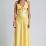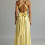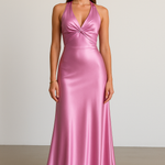 Sleek and luminous, this satin halter gown is a statement in understated glamour. Featuring a twist-front bodice and dramatic open back with bow, it brings elegance from every angle.