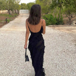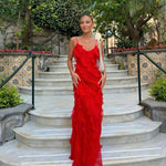 Romantic and effortlessly striking. This chiffon maxi dress flows with soft ladder ruffle detailing, designed to catch the light with every movement. With its plunging V-neckline, open back, and semi-sheer finish, it’s the perfect choice for summer soirées and elegant garden gatherings.