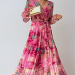 Designed for vibrant elegance. This flowing wrap maxi dress features a painterly floral print in vivid shades of pink, green, and gold. The lightweight fabric drapes beautifully, while the belted waist and V-neckline create a flattering silhouette. Long sheer sleeves with elastic cuffs add a delicate finish, making it the perfect choice for summer occasions that call for both comfort and sophistication.