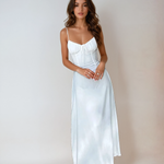 Designed for graceful simplicity. This satin maxi dress features delicate spaghetti straps, a ruched bodice with subtle drawstring detail, and a flowing silhouette that drapes effortlessly. The lightweight fabric adds a touch of fluid elegance, making it a perfect choice for both warm summer days and special evening occasions.