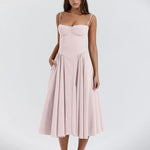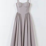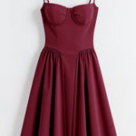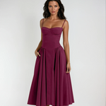 Vintage charm with a structured twist. This elegant midi dress features a sculpted bustier bodice and a full gathered skirt with pleats that add volume and movement—crafted for timeless celebrations and graceful moments.