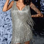 Designed to make an entrance, this shimmering fringe mini dress captures the spirit of celebration and effortless glamour. Covered in sequined tassels that move with every step, it combines playful energy with a chic silhouette. The sleeveless cut and flattering V-neckline add a touch of modern sophistication—perfect for nights that call for all eyes on you.