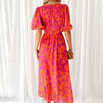 Designed for effortless summer elegance. This vibrant floral midi dress features a plunging V-neckline, puff sleeves, and a flowing silhouette that moves beautifully with every step. The elastic waist ensures a flattering fit while keeping comfort at the forefront—perfect for garden parties, seaside dinners, or sun-drenched getaways.