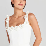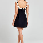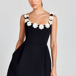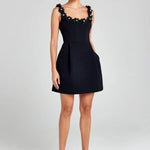 Playful charm meets refined elegance. This tailored mini dress features a fitted bodice and A-line skirt, adorned with 3D floral appliqués along the neckline and straps for a romantic touch. The structured shape creates a flattering silhouette, while hidden side pockets add a modern, functional detail.
