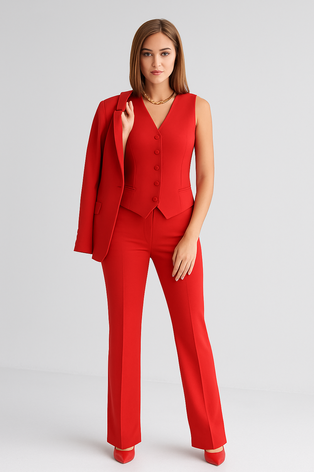 Designed for comfort with a playful twist. This tailored three-piece suit in deep emerald green redefines modern sophistication. Featuring a sleek blazer, matching waistcoat, and straight-leg trousers, it offers a polished yet feminine silhouette. Crafted from smooth structured fabric, it’s perfect for days when you want to command attention with confidence and style.