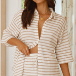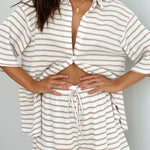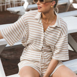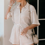 An effortless set designed for sun-filled days. Featuring a relaxed button-up shirt and drawstring shorts, this beige striped knit co-ord is soft, airy, and endlessly wearable.