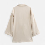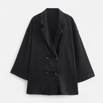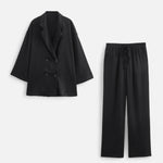 Designed for transitional days, the double-breasted jacket with its turn-down collar brings timeless structure, while the mid-waisted trousers flow with relaxed confidence. Together, they form a statement ensemble — polished yet unrestrained, perfect for both business casual settings and refined weekend style.