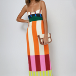 Playful and bold. This colour-blocked midi dress features vibrant vertical stripes, a flattering empire waist, and thin adjustable straps—perfect for sunny days and statement styling.