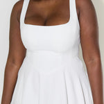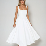Effortlessly elegant with timeless flair. This sleeveless midi dress features a flattering square neckline and a full, flared skirt that flows with every step—perfect for sunlit celebrations or evening soirees.