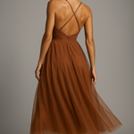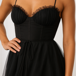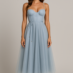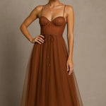 Effortlessly romantic with a soft vintage touch. This corset chiffon midi gown features delicate spaghetti straps, a ruched bust, and an airy layered tulle skirt that flows with every step. It's a timeless silhouette designed to flatter and move gracefully through warm evenings.