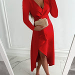 Timeless elegance meets modern sophistication in this wrap-style midi dress. Crafted with a flattering V-neckline and long sleeves, it enhances the silhouette while offering comfort and ease of movement. The asymmetric hemline adds a contemporary touch, making it perfect for both formal events and elegant evenings out.