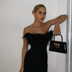 Dramatic, elegant, and undeniably alluring — this off-shoulder mini dress brings Old Hollywood glamour into the modern era. Designed with a sleek silhouette and adorned with soft feather trim along the neckline, it exudes sophistication with a touch of playful seduction. Perfect for evenings that call for attention and confidence.