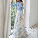 Graceful movement meets ethereal elegance. This flowing chiffon maxi dress features a soft sky-blue bodice with a deep V-neckline and bishop sleeves, paired with a romantic floral-print skirt. Designed to drape beautifully with every step, it blends sophistication and lightness—perfect for special occasions or dreamy summer evenings.