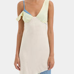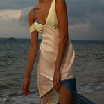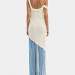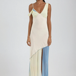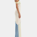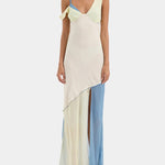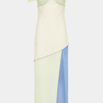 Lightweight elegance meets contemporary contrast. This asymmetric pastel maxi dress features delicate colourblock panels, a soft draped bust overlay and a flowing semi-sheer skirt with a front split—crafted to make a statement at any summer soirée or elevated event.