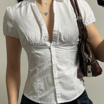 Designed to flatter with its tailored silhouette and soft structure, this slim-fit poplin shirt adds a polished yet playful feel to your everyday wardrobe. Featuring a deep V-neckline, puffed sleeves and delicate ruching at the bust, it brings a modern femininity to classic shirting—perfect for everything from coffee catch-ups to evening dinners.