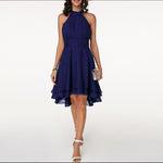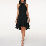 Designed for moments that call for timeless femininity, this sleeveless chiffon dress features a high halter neckline and a softly layered hemline that moves beautifully with every step. The cinched waist creates a flattering silhouette, while the airy fabric adds elegance and ease—perfect for weddings, celebrations, or evening occasions.