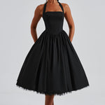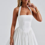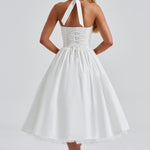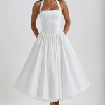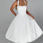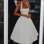 Vintage glamour redefined. This white halter midi dress channels timeless elegance with a fitted bodice and full flared skirt, creating a silhouette that's both classic and captivating—perfect for bridal moments or summer soirées.